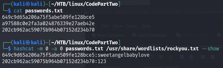 hashcat -m 0 -a 0 passwords.txt /usr/share/wordlists/rockyou.txt