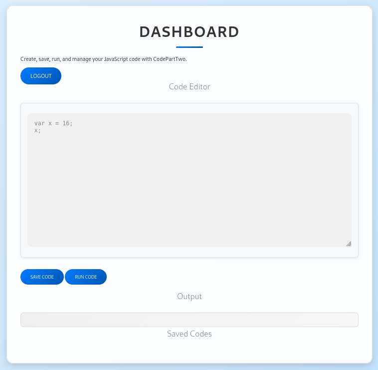http://10.10.11.82:8000/ [200 OK] Country[RESERVED][ZZ], HTML5, HTTPServer[gunicorn/20.0.4], IP[10.10.11.82], Script, Title[Welcome to CodePartTwo]